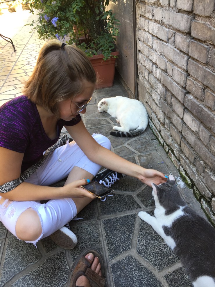 Though feeling a little jealous at first that the felines were allowed to freely wander the ruins, we were pleasantly surprised to climb down the steps to the underground shelter and office and be among the cats for as long as we liked. Proud of their mission, the staff allowed us to pet and play, while drawing our attention to calendars, t-shirts and other merchandise whose proceeds help fund the local pet population.